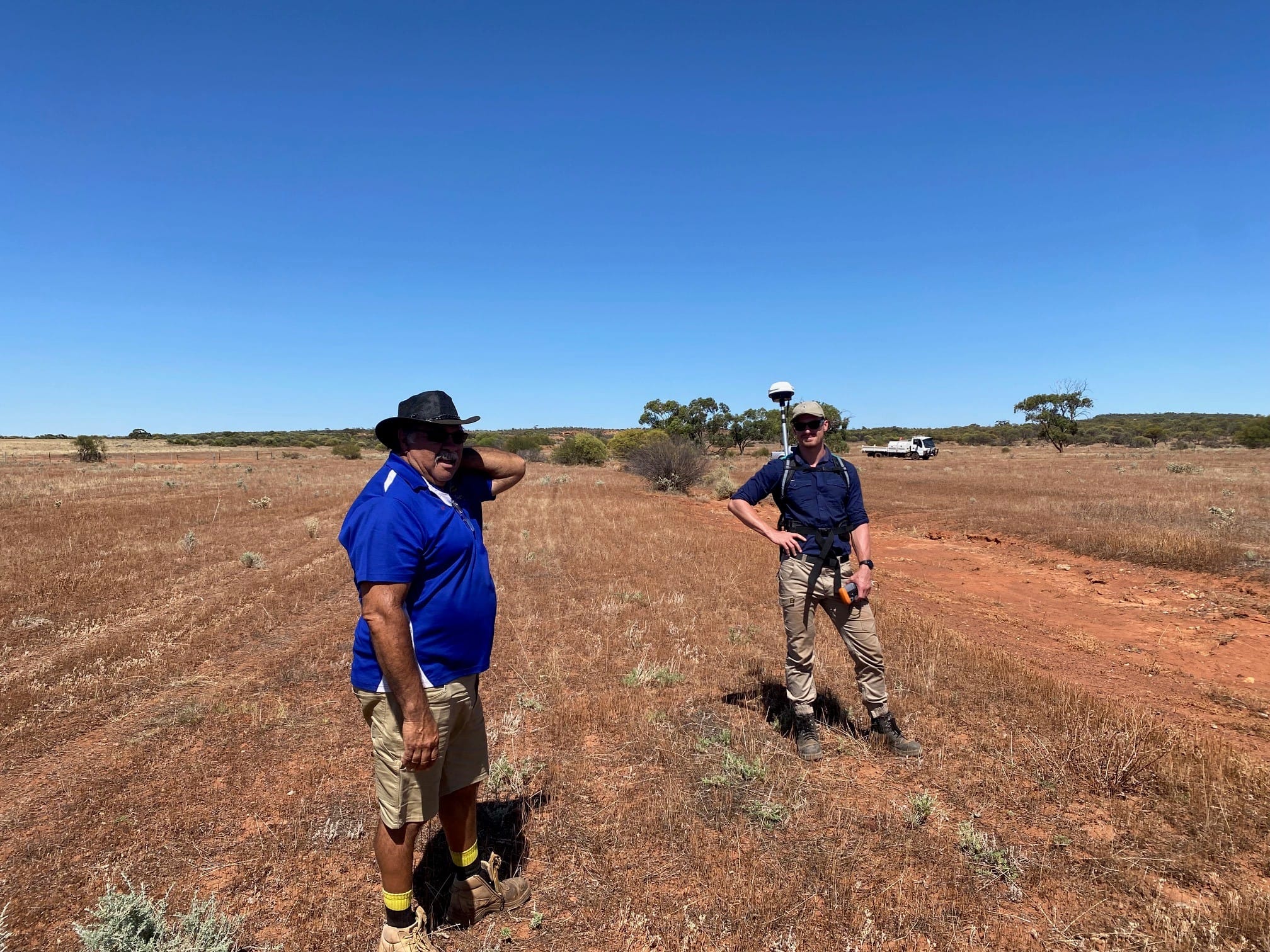 Clint Hansen (Maaman Marra Boodjar) and a research assistant mapping sites using Differential GPS. Photo: David Blake